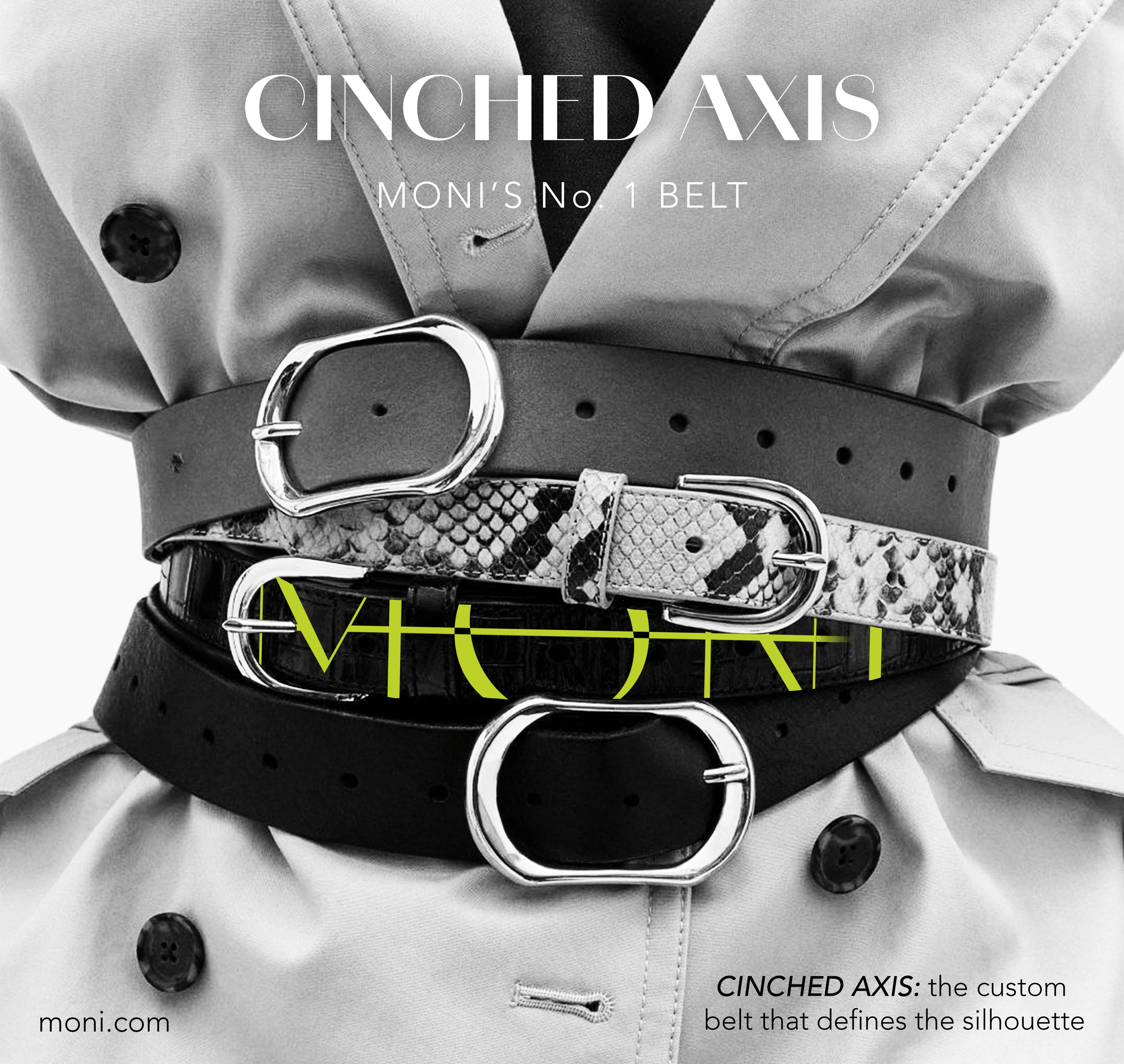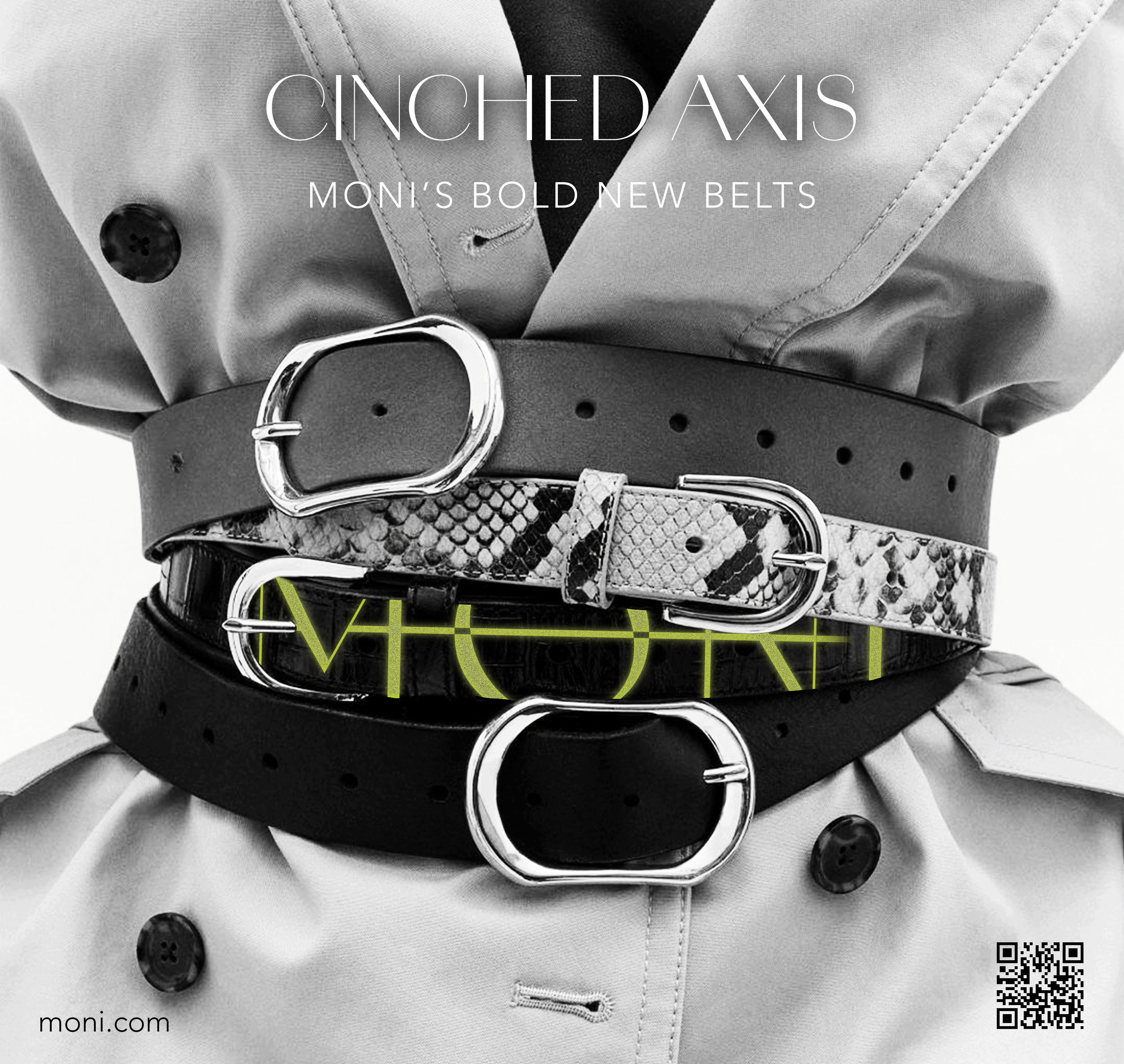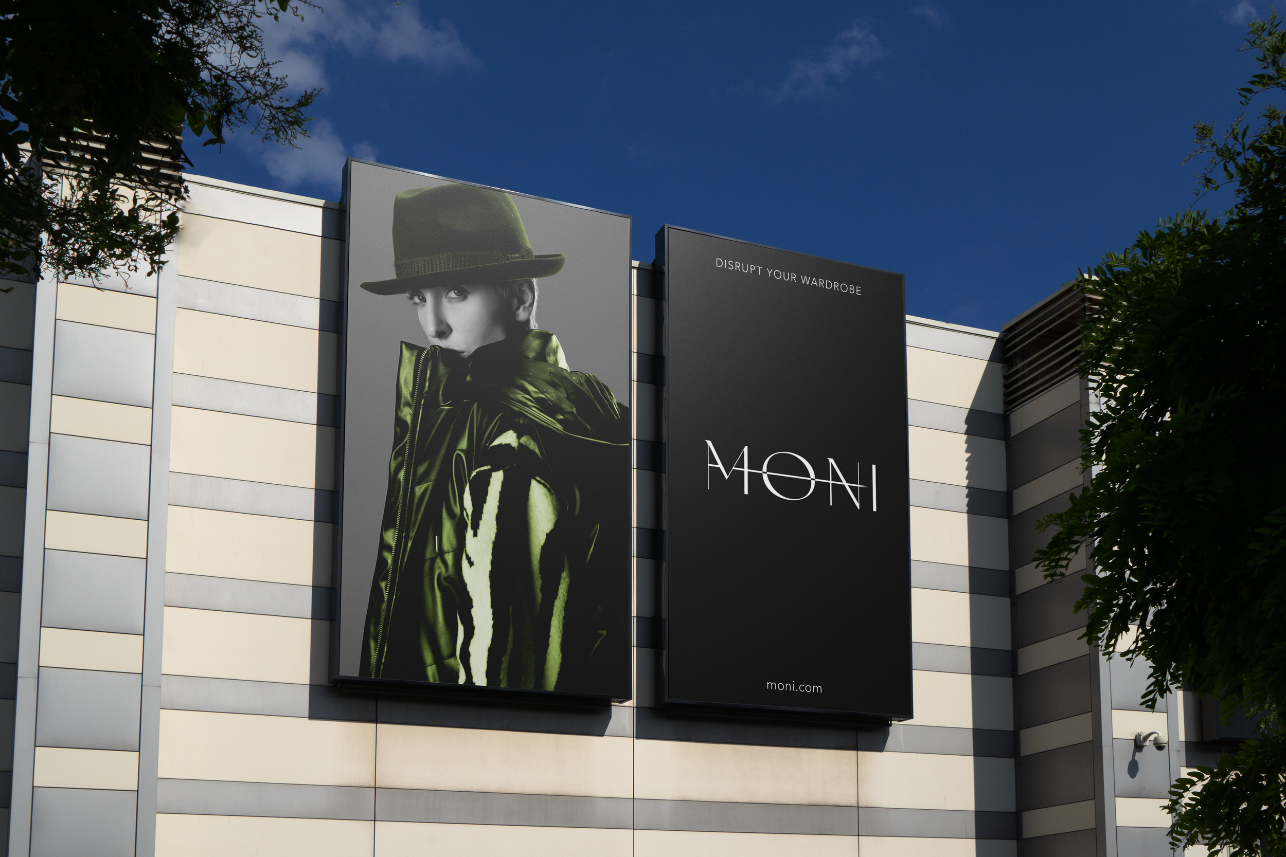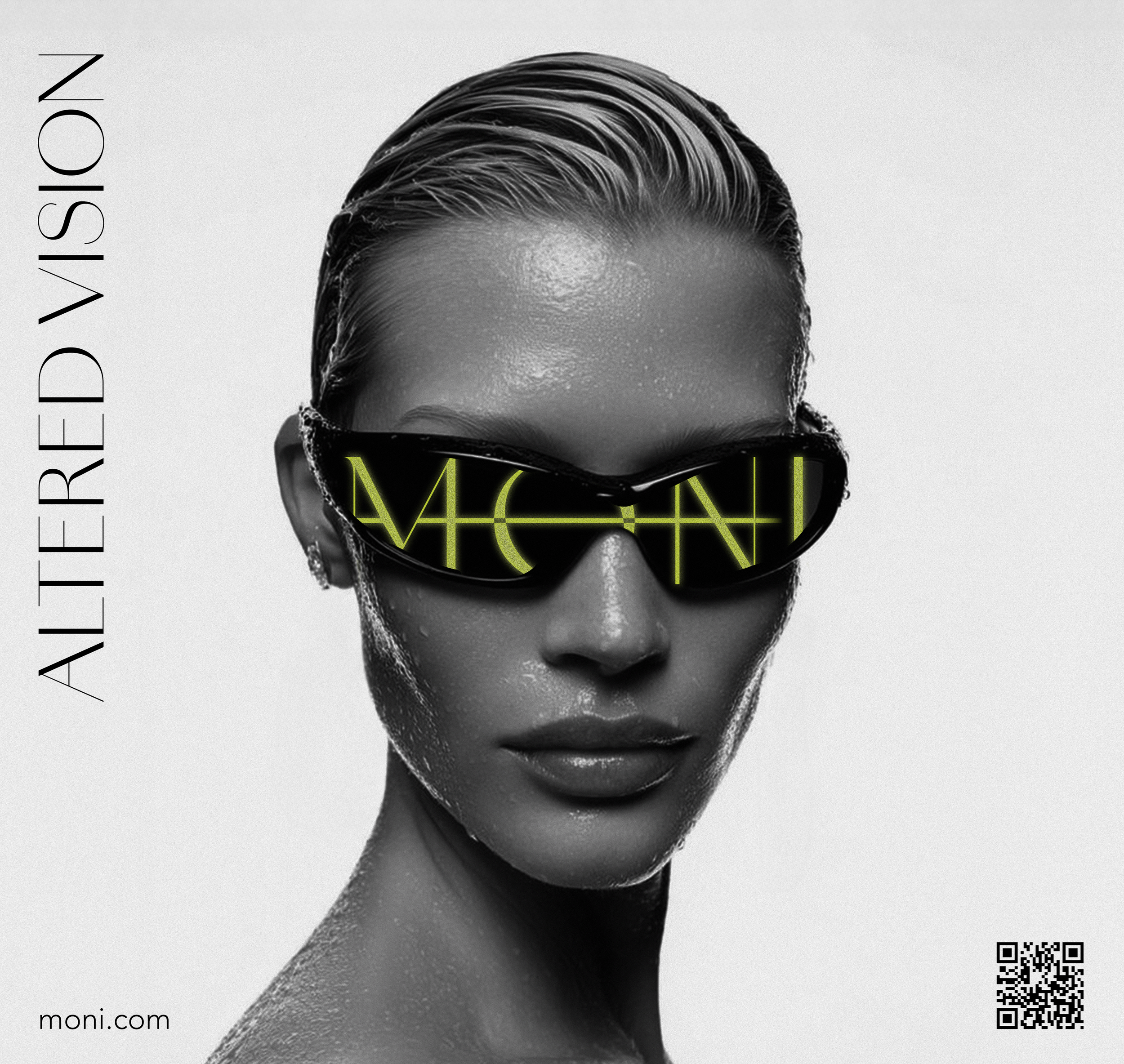 The horizontal line that runs through the typography contributes to the "disruption" brought about by wearing MONI's statement pieces.